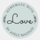 Simple et moderne fait maison avec amour, icônes de feuille de laurier, écriture et autocollant vert sauge clair de police moderne.