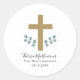 Ce design rustique simple présente des feuilles d'eucalyptus aquarelle avec une croix dorée au centre, avec le nom de l'enfant en jolie typographie script et première communion sainte et la date sur le bas de l'autocollant. Veuillez consulter cette collection pour coordonner les invitations religieuses.