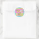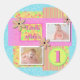 Faites de ce premier anniversaire un moment inoubliable avec cet autocollant rond ludique avec un design de scrapbooking rose, jaune, vert et aqua. Ajoutez deux jolies photos pour une célébration personnalisée. À associer avec le ruban, la carte et les sacs cadeaux assortis.