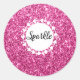 Fille et glam parties scintillant rose chaud scintille classique collant rond avec le mot "Sparkle" en noir et un arrière - plan blanc avec des coeurs blancs.