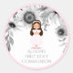 Mignonnes filles roses et grises saintes autocollants de communion - Douce fille avec de longs cheveux brun en robe et des prières sur le bandeau au centre. Elégant, noir et blanc, look vintage tournesol couleur bordure en haut sur arrière - plan blanc. Cadre dans un contour rose. Nom personnalisé et 'Première Sainte Communion' dans élégant texte gris ci-dessous. Jolie florale rose filles communion enveloppe les phoques pour l'été et l'automne. Cliquez sur l'option Personnaliser pour modifier les couleurs, la taille et les polices du texte.