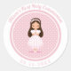 Jolies filles roses saintes autocollants de communion - Douce fille avec de longs cheveux bruns en robe et un bandeau prier au centre sur un motif pois blanc classique sur arrière - plan rose. Nom personnalisé et 'Première Sainte Communion' dans élégant, rose assorti, texte courbe ci-dessus. Le bas affiche la date courbée rose.Bordé de contour rose et blanc. Jolies filles communion enveloppe les phoques. Cliquez sur l'option Personnaliser pour modifier les couleurs, la taille et les polices du texte.