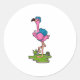 Sticker Rond Flamant rose comme randonneur avec sac à dos