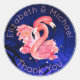 Une aquarelle éclatante illustration de deux flamants roses sur fond bleu brillant de caractéristiques feuilles palmiers sur ce modèle autocollant de qualité, idéal pour les faveurs de mariage ou l'emballage.