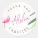 Aloha écriture manuscrite moderne jeune fille tendance luau hawaïen fête d'anniversaire Merci sticker / cadeau d'emballage de faveur avec un flamand rose chaud et feuilles tropicaux verts. +++++++++++++++++++++++ Convient aux filles été luau tropical hawaïen thème, plage ou par les fêtes d'anniversaire de la mer.
