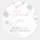 Express votre gratitude avec notre baby shower merci autocollant. "Merci" dans une calligraphie rose délicate se distingue par son arrière - plan gris subtil, orné de flocons de neige en parties scintillant argent et d'accents roses.
