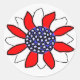 Fleur patriotique rouge blanc et bleu sur un autocollant rond avec un fond blanc.
