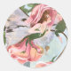 Dans cet imprimé victorien cette jolie fée de fleurs fait en fait partie des roses roses. Sa casquette et sa jupe sont des pétales roses et sa robe est faite des feuilles verts du rose. Elle poursuit une conversation avec un petit elfe vêtu de vert pour se fondre dans le bush rose.