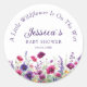 Spécial client, mignon, fleur sauvage, rose violet, baby shower blanc classique collant rond avec votre nom et date. Modifiez votre produit en quelques minutes. Vous pouvez modifier la police/taille/couleur et la position en utilisant "personnaliser davantage".
