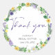 Ceci est un autocollant de remerciement sur le thème des fleurs sauvages rustiques et de la verdure pour une baby shower ou une fête prénatale. Le design présente une couronne florale botanique utilisant une variété de fleurs sauvages printanières, de verdure rustique de campagne ainsi que de coccinelles.