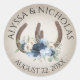 Fleurs bleues et fer à cheval grange rustique préférez l'autocollant avec le nom de la mariée et du marié et la date du mariage.