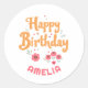 Floral Flowers Joyeux Sticker Manulettering Anniversaire. Célébrez un anniversaire spécial pour une fille avec ces stickers personnalisés de charme! Doté d'un design floral dessiné à la main, joyeux texte "Joyeux Anniversaire" en écriture orangée ludique, et un nom personnalisé. Idéal pour les filles, nièces, petites-filles ou amis.