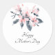 Des autocollants Joyeux de la Fête des Mères avec une jolie aquarelle illustrant des fleurs roses avec des feuilles gris sur une seule tige. Un design botanique moderne et élégant.