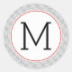 Autocollant de Noël motif de fêtes de Noël monogramme moderne. Cet autocollant de vacances présente votre monogramme en noir dans un cadre rond blanc avec contour rouge. Il y a un motif de fakes de neige blancs sur gris autour.