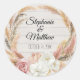 "Sticker rond Floral Boho Pampas Palm Rustic Wood Mariage Classic." L'arrière - plan rustique et élégant de la grange en bois de chalet améliore l'aquarelle de la couronne Boho avec l'herbe de pampas, feuilles de paume de ventilateur séché, roses roses roses et orchidées blanches. Créée par Audrey Jeanne Roberts, artiste et créatrice de renommée internationale. Droit d'auteur .