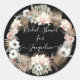 Floral Black Blush White Rustic Bois Palm Foliage Fête des mariées Classic Round Sticker pour enveloppes scellés, préférez les sacs cadeaux ou autres décorations de douche nuptiale. L'arrière - plan noir, riche en ébène, contraste et met en valeur l'oeuvre délicate et aquarelle d'orchidées blanches crémeuses, le feuillage de palmiers kaki tan, les feuilles tropicaux secs de style boho et la couronne de fougère à sauge muettée. Copyright, Audrey Jeanne Roberts.