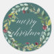Terminez vos cartes de fin de année et cadeaux avec ces stickers élégants et festifs avec "Joyeux Noël" en écriture calligraphie moderne blanche sur un arrière - plan vert d'épinette, encerclé par une couronne d'aquarelle de fleurs rouges et de verdure. Conçu pour correspondre à notre collection de cartes de vacances Winter Blooms.