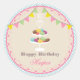 Un autocollant d'anniversaire avec un thème de fête du thé. Illustration du stand à deux niveaux de macarons français au centre. Arrière - plan est bleu en vichy motif et beige dentelle aux accents roses. en vichy et solide à la partie supérieure. Personnalisez le texte.