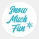 Flocon de neige bleu aqua brillant avec le texte "enneiger beaucoup de plaisir" sur blanc.