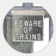 Un design artistique de la vieille porte du bureau de réservation sur la plate-forme de la gare avec un avertissement de non entrée et de se méfier des trains de l'époque du train à vapeur.