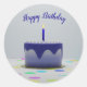 Un gâteau d'anniversaire en caricature bleue avec un glaçage couvert d'arrosage qui coule sur les côtés et une bougie éclairée est posée sur une plaque dorée sur un comptoir couvert de points colorés.