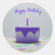Un gâteau d'anniversaire en caricature violette avec un gel couvert d'arrosage qui coule sur les côtés et une bougie éclairée est posée sur une plaque dorée sur un comptoir couvert de points colorés.