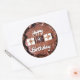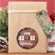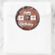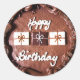Le dessus d'un gâteau de chocolat avec trois décorations actuelles et les mots "joyeux anniversaire"