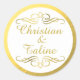 Un autocollant rond élégant et élégant, avec un faux papier doré, fleurit sur un arrière - plan blanc, avec une bordure dorée classique. Cliquez sur le bouton CUSTOMISER IT pour ajouter votre texte. Vient en 5 couleurs. Correspondance des invitations mariages, enregistrer les dates, cartes de table, RSVP, serviettes de cocktail, dessous de verre et plus encore disponibles. Pour toute question ou demande d'autres articles présentant cette conception, veuillez communiquer avec : cheryl@cheryldanielsart.com. "Tourbillonnant Flourish with Frame" par Cheryl Daniels © 2015.