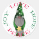C'est un autocollant mignon pour une utilisation polyvalente pendant la saison des Fêtes. Il est orné d'un adorable gnome barbu habillé de vert avec une longue barbe et un casquette de flocon de neige. Il tient une étoile d'or. L'image est encerclée par le texte Love Hope Peace Joy en rouge et vert.