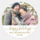 Élégant Script moderne Or et blanc "Happy Holidays" Calligraphie Script Couple Photo Holiday Grand Sticker rond de Noël. Idéal pour les enveloppes d'accessoires de messagerie et les autocollants-cadeaux.