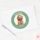 L'image d'un adorable chien de chiot Golden Retriever portant un casquette d'hiver est au centre de cet autocollant Holiday. L'image est encadrée dans une bordure circulaire verte qui contient votre texte personnalisé en blanc. Idéal pour les cartes de Noël, la correspondance et les forfaits cadeaux.