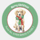 L'image d'un adorable chien Golden Retriever portant un écharpe d'hiver rouge et vert est au centre de cet autocollant Holiday. L'image est encadrée dans une bordure circulaire verte qui contient votre texte personnalisé en blanc. Parfait pour les cartes de Noël, la correspondance et les forfaits cadeaux.