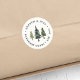 Les autocollants rustiques chic pour votre extérieur, aventure, ou entreprise orientée nature disposent d'un trio de pins verts chasseurs avec deux champs de texte personnalisés dans un design circulaire incurvé.