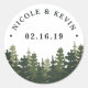 Les autocollants rustiques chic pour votre extérieur, les bois ou les mariages aventureux disposent d'une forêt de pins verts chasseurs avec votre nom et date mariage en lettres de bloc.