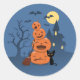 Un mignon chat noir et un balai de sorcière près d'une pile de citrouilles riants qui tombent. Un arbre mort, un manoir déplaisant, des chauves-souris et la lune sont vus sur l'arrière - plan.