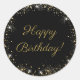A black background. Black text: Happy Birthday! Decorated with faux gold glitter.