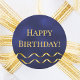 Navy blue uneven colored background. Text: Happy Birthday! Decorated with golden party streamers.
