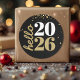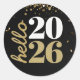 This stylish circular design features a dramatic matte black background sprinkled with gold confetti and metallic ribbons. The focus is the greeting "Hello" in shimmering faux gold glitter script, boldly placed next to the year "2026" in large, easy-to-read white and gold fonts.