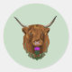 Portrait d'une vache écossaise de montagne auburn cheveux. Un chardon écossais avec un noeud Celtique vert est devant la vache.