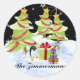 PALETTE DE COULEUR : Tendance moderne de Noël noir et blanc avec chaux jaune, or, vert et rouge. COLLECTION DE DESIGN : Personnalisée avec votre propre nom de famille en utilisant le champ de modèle facile, vous pouvez créer vos propres étiquettes personnalisés, toppers de paquet ou scellés d'enveloppe. Il s'agit d'un autocollant fantaisiste, amusant, à thème Noël et hiver, d'un sceau ou d'un ensemble de décoration qui a été fait d'aquarelles peintes à la main d'Audrey Jeanne Roberts. Les arbres de Noël sont décorés d'une guirlande rouge drapée, de toppers d'étoiles tourbillonnantes en tas de neige avec des flocons de neige faits main tombant dans l'arrière - plan et un mignon manchot joue avec une pile de paquets emballés cadeau surmonté d'un arc rouge et d'un oiseau mignon et lunatique avec une queue tourbée. Ce design est disponible sur une large gamme de produits.