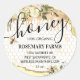 Autocollants vintages personnalisés pour coller sur des pots alimentaires avec des bords en cristal d'agate de parties scintillant jaune et or, un arrière - plan de nid d'abeille, gouttes de miel, flores d'aquarelle blanche, abeilles, et vos détails apiaires.