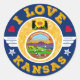 I Love Kansas State Map and Flag (Carte d'état et drapeau du Kansas). S'inspirant du drapeau de l'État, ce design présente un code couleur bleu et or, ainsi que des coeurs rouges et des accents blancs. Ce cadre le motif central du drapeau d'état, affiché avec la silhouette du drapeau d'état derrière le tournesol. Avec la typographie en détresse cool avec l'expression 'I LOVE KANSAS'.