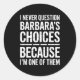 Sticker Rond I Never Question Barbara's Choices Because I'm One