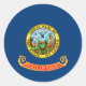 Le Flag of the state of the Idaho consis ts of the state seal on a field of blue. "État de l'Idaho" appear in gold letters on a red and gold band below the seal. according to the official description of the flag, there should be a fringe of gold around the edges, but a long time the versions of the flag not shown until they remodeled the flag after. The seal, in the center of the flag, depicts a miner and a woman representing equality, liberty and justice. The symbos on the seal represent some of Idaho’s natural resources: mines, forests, farmland, and wildlife.