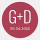 Sticker rond classique mariage rouge bordeaux simple et élégant. Il affiche votre initiale et la date de votre mariage en blanc sur rouge vif bordeaux. Il coordonne avec nos produits "Colorful leaf print" pour un mariage automne ou automne.