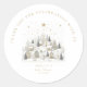 It Takes a Village Snowy Whimsical Baby Shower Classic Round Sticker - coordinate perfectly with other products in the collection. Stickers read - Thank you for celebrating with us and are personalized with Mother to be's name, Baby Shower and Date