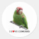 Une perruque masquée rouge, c'est-à-dire une conure à tête de cerise, est montrée avec les mots "I love conures" et le "O" dans "love" est remplacé par un petit coeur rouge