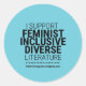 Soutenez-vous la littérature féministe, diversifiée et inclusive pour tous ? Partagez vos croyances avec cet autocollant. Police blanche sur bleu clair/arrière - plan turquoise.