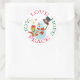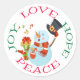 C'est un autocollant mignon pour une utilisation polyvalente pendant la saison des Fêtes. Il présente une image de dessin d'un petit bonhomme de neige levant son chapeau et chantant son coeur. À côté de lui, il y a une pile de cadeaux de Noël aux couleurs vives. L'image est encerclée par le texte Love Hope Peace Joy en rouge et vert.