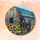 Sticker Rond Joli cheval noir et grange rustique avec tournesol